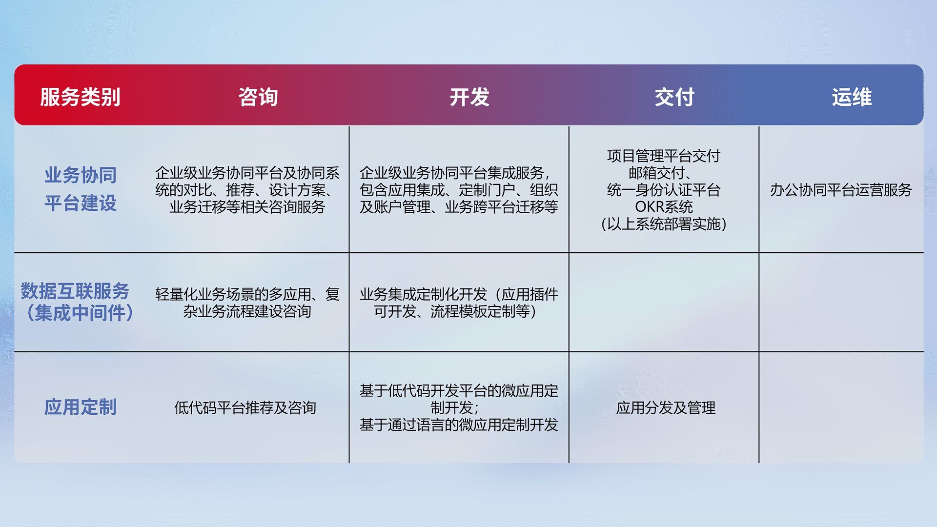 针对钉钉、、企微、、IDaas等平台级产品提供产品的规划、、、方案、、、、交付、、定制化开发等服务,,,实现如统一协同办公、、、、智能客户服务、、、、混合会议管理、、智能数据查询、、、等业务场景,,实现数字化转型。。
