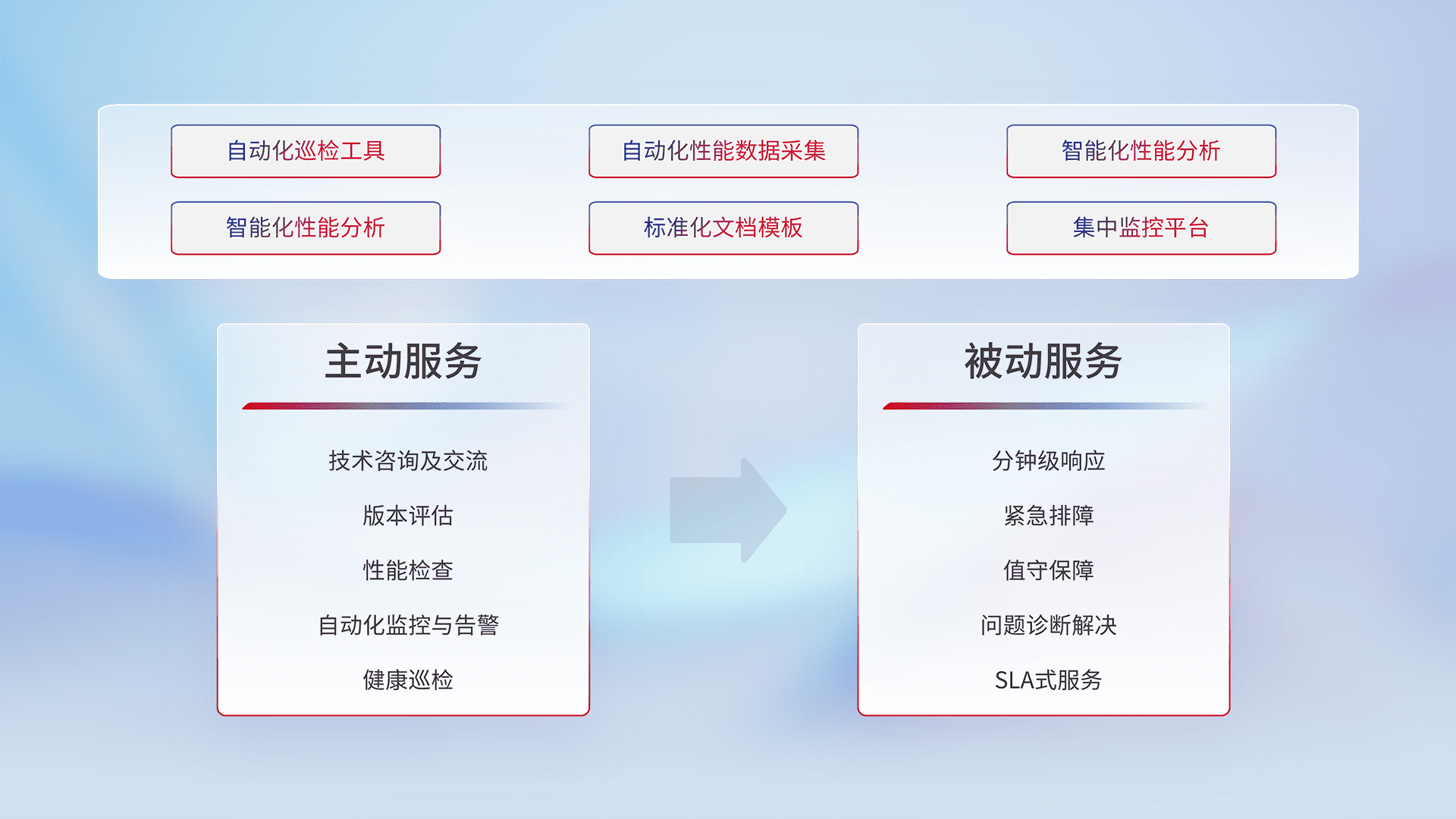 智能化工具和标准化文档,,,保障服务质量,,,提供主动服务(包含技术咨询、、、版本评估、、、、性能检查、、自动化监控与告警、、、、健康巡检)和被动服务包含(分钟级响应、、、、紧急排障、、、、值守保障、、、、问题诊断解决、、、、SLA服务)。。。